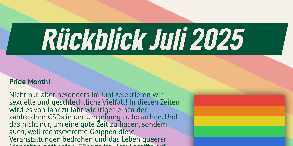 Vielfalt leben: Pride Month und CSDs Besonders im Juni haben wir die sexuelle und geschlechtliche Vielfalt gefeiert. Es wird von Jahr zu Jahr wichtiger, die zahlreichen CSDs in unserer Umgebung zu besuchen. Das tun wir nicht nur, um eine gute Zeit zu haben, sondern auch, weil rechtsextreme Gruppen diese Veranstaltungen bedrohen und das Leben queerer Menschen gefährden. Für uns ist klar: Angriffe auf unsere queeren Mitmenschen sind Angriffe auf uns alle. Also, raus auf die Straße!