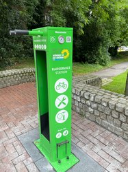 Eine schnelle und einfache Lösung für Reparaturen am Fahrrad unterwegs bietet die neue Servicestation, die mit Mitteln der Partei Bündnis 90/ Die Grünen und Unterstützung der Stadt Lünen in der Bäckerstraße aufgestellt wurde. Mit speziellen Werkzeugen und einer Luftpumpe sind kleinere Reparaturarbeiten leicht durchzuführen.