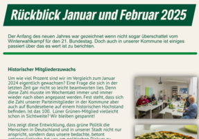 Die Bundestagswahlen sind vorbei. Nach 2 Monaten Winterwahlkampf und dem Ende der ersten Ratsperiode im Jahr 2025 ist es im März politisch ruhig geworden. Das heißt aber nicht, dass nichts passiert ist! Hier ein paar Einblicke aus dem aktuellen Grünblatt vom März.